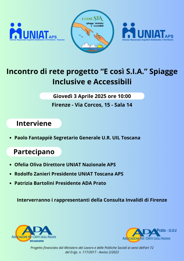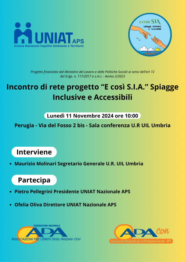 PARTNER: UNIAT LAZIO APS, UNIAT CAMPANIA APS, UNIAT SICILIA APS, UNIAT SARDEGNA APS, UNIAT LIGURIA APS, UNIAT MOLISE APS, UNIAT PIEMONTE APS, UNIAT TOSCANA APS, FEDERAZIONE NAZIONALE DELLE ASSOCIAZIONI PER I DIRITTI DEGLI ANZIANI (ADA) DI VOLONTARIATO – ODV (breviter, ADA), ADA CON NAZIONALE – ASSOCIAZIONE NAZIONALE PER LA PROMOZIONE SOCIALE – APS” (breviter ADACON), ADA PRATO, ADA VENETO e ADA POTENZA.