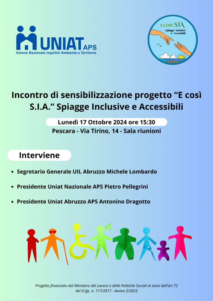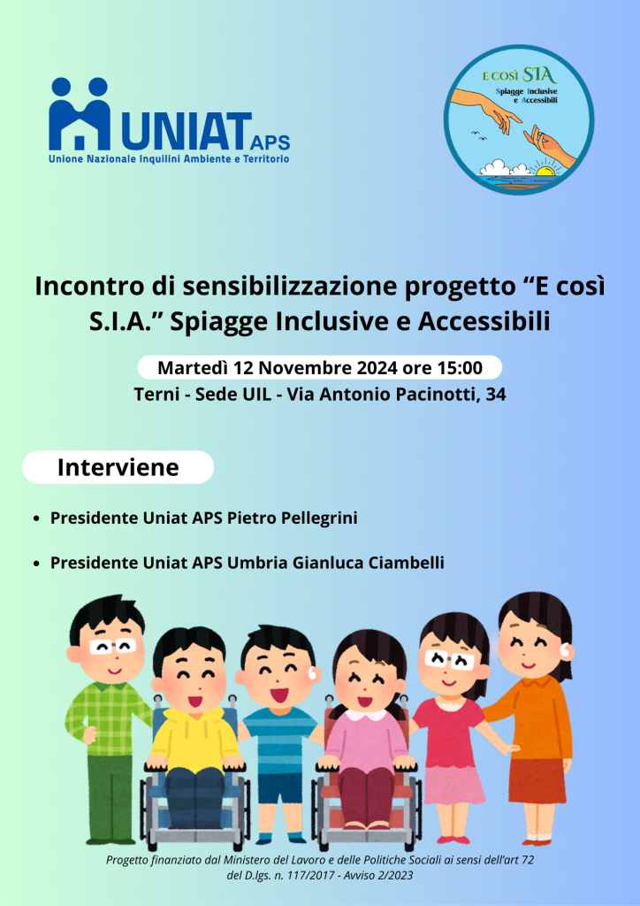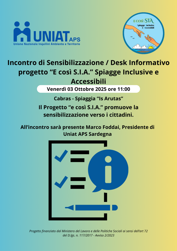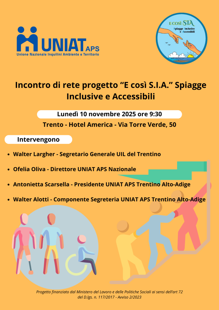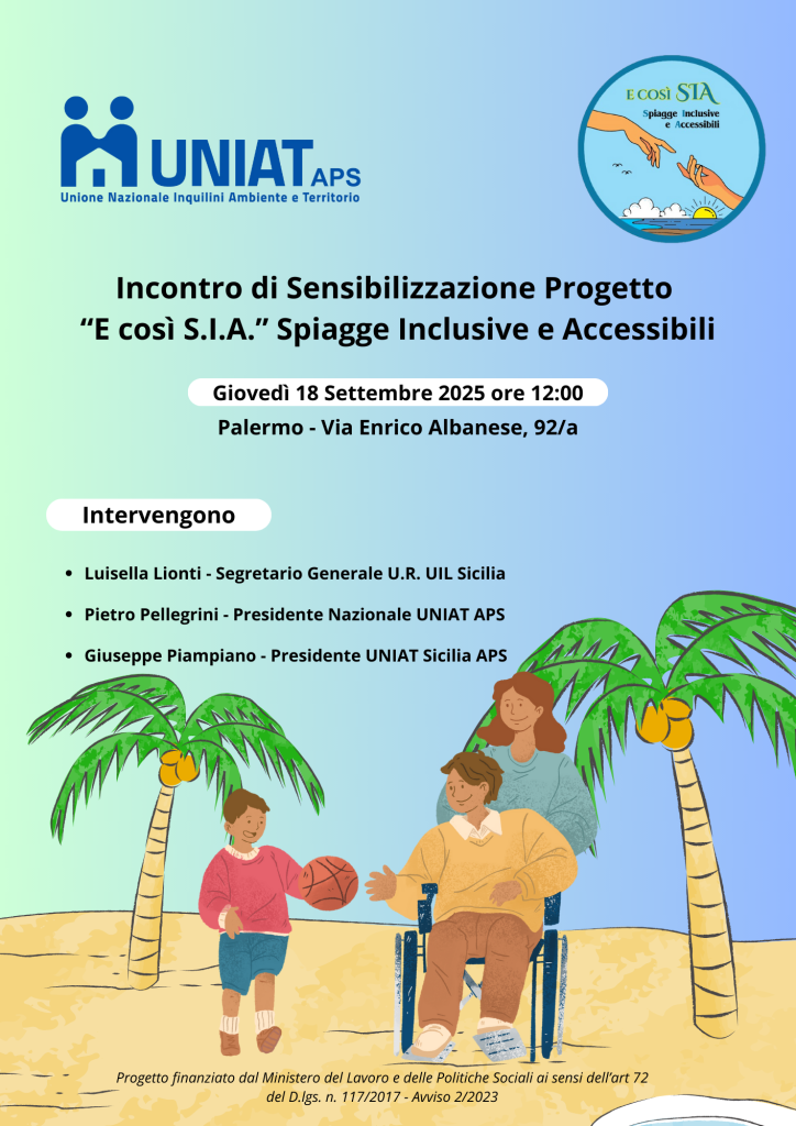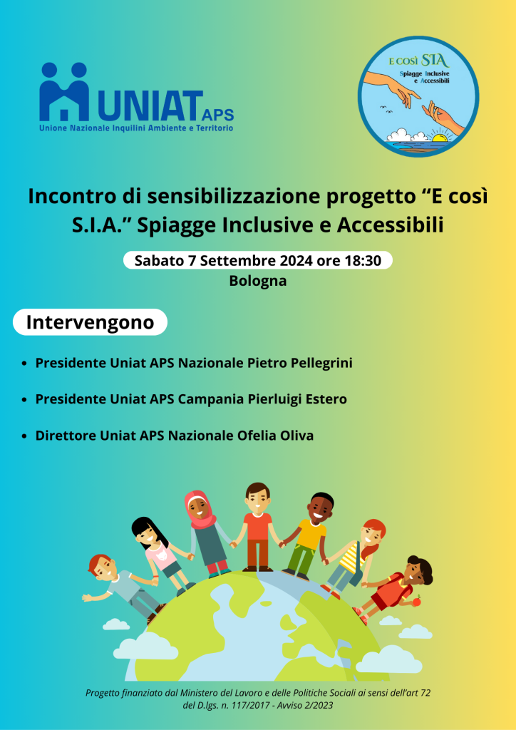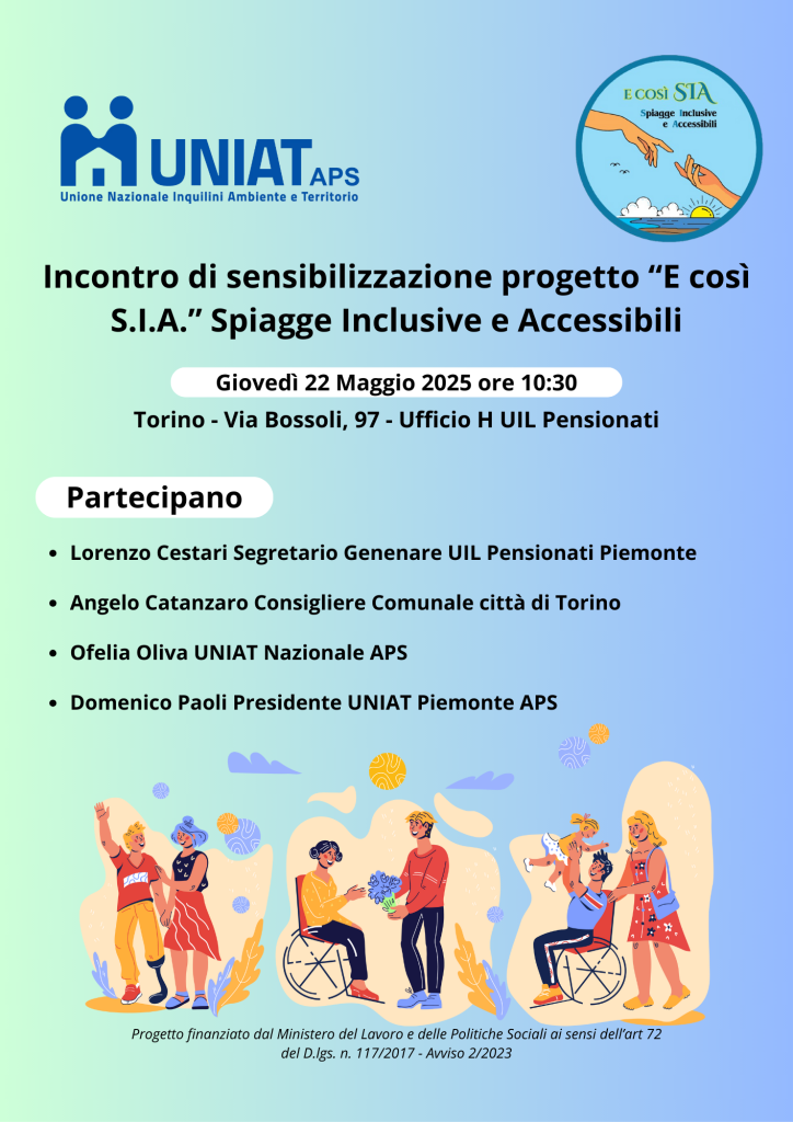 UNIAT, unitamente ai propri partner, intende realizzare un progetto finalizzato a favorire i processi di inclusione sociale delle persone con disabilità, degli anziani con problemi di autonomia e, più in generale, di tutte le persone con mobilità ridotta, anche temporanea, attraverso la realizzazione di interventi che aumentino l’accessibilità alle spiagge di mari e laghi. Una soluzione innovativa che guarda alla richiesta di supporto da parte delle persone con limitazioni (fisico- motorie, ma anche cognitive, sensoriali, …) in maniera innovativa, non ragionando distintamente per singole categorie di destinatari ma trasversalmente per “bisogni assistenziali” comuni che possono essere efficacemente affrontati attraverso attività che promuovano i diritti, riducano le diseguaglianze e accrescano le opportunità sociali, anche mediante la realizzazione delle altre attività (di sensibilizzazione e di animazione territoriale) promosse dal progetto.