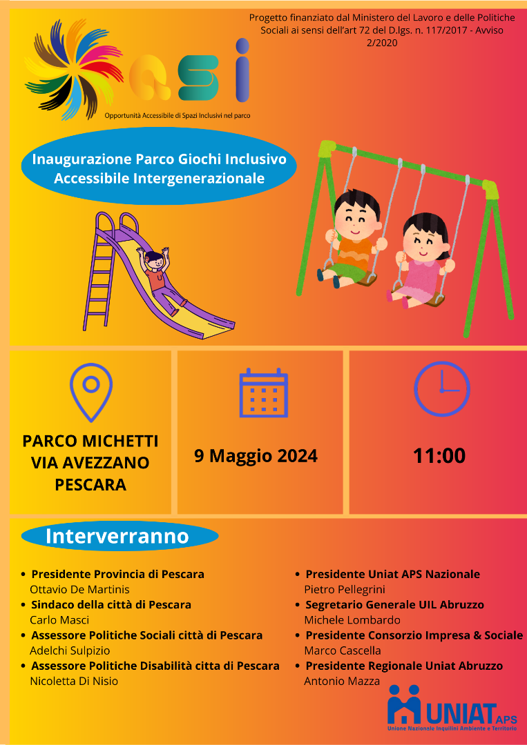 Il Presidente UNIAT Pietro Pellegrini ed il Sindaco della città di Pescara Carlo Masci, alla presenza del Presidente Uniat Abruzzo Antonio Mazza, hanno inaugurato oggi il Parco Giochi Inclusivo Michetti sito in Pescara, via Avezzano, realizzato nell’ambito del Progetto OASI (Opportunità Accessibile di Spazi Inclusivi) nel Parco – Parco Giochi Inclusivo intergenerazionale, promosso dal Ministero del Lavoro edelle Politiche Sociali che intende rendere le città e gli insediamenti umani più inclusivi, sicuri e sostenibili, promuovendo la salute e il benessere di tutti i cittadini, di tutte le età.
