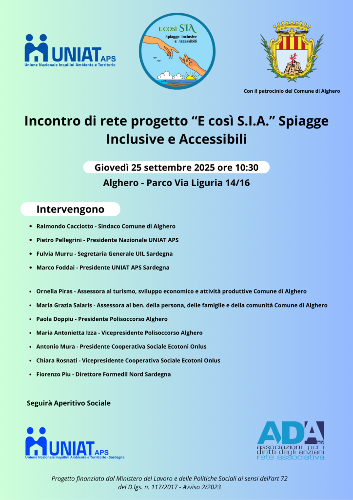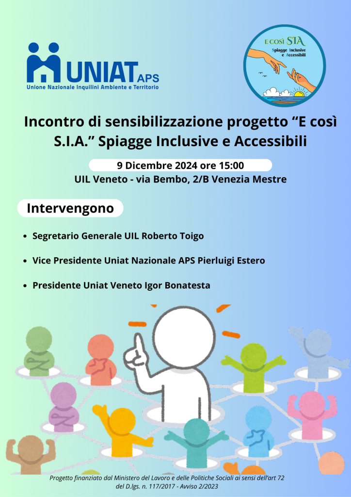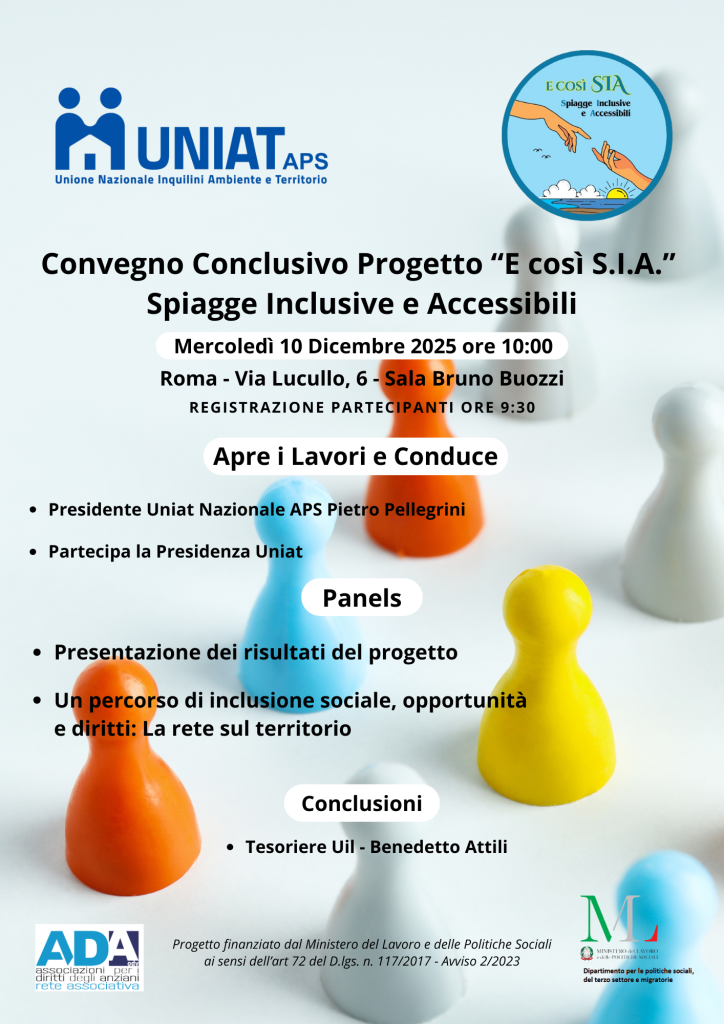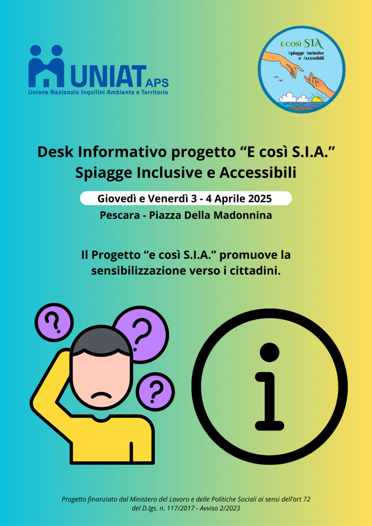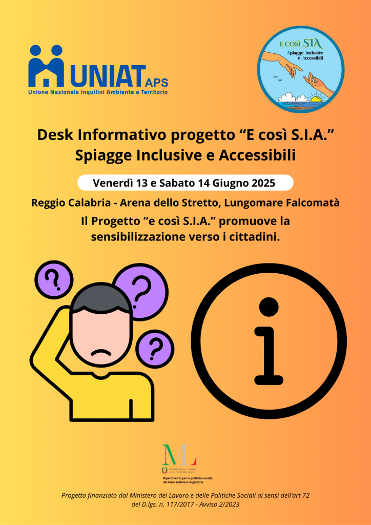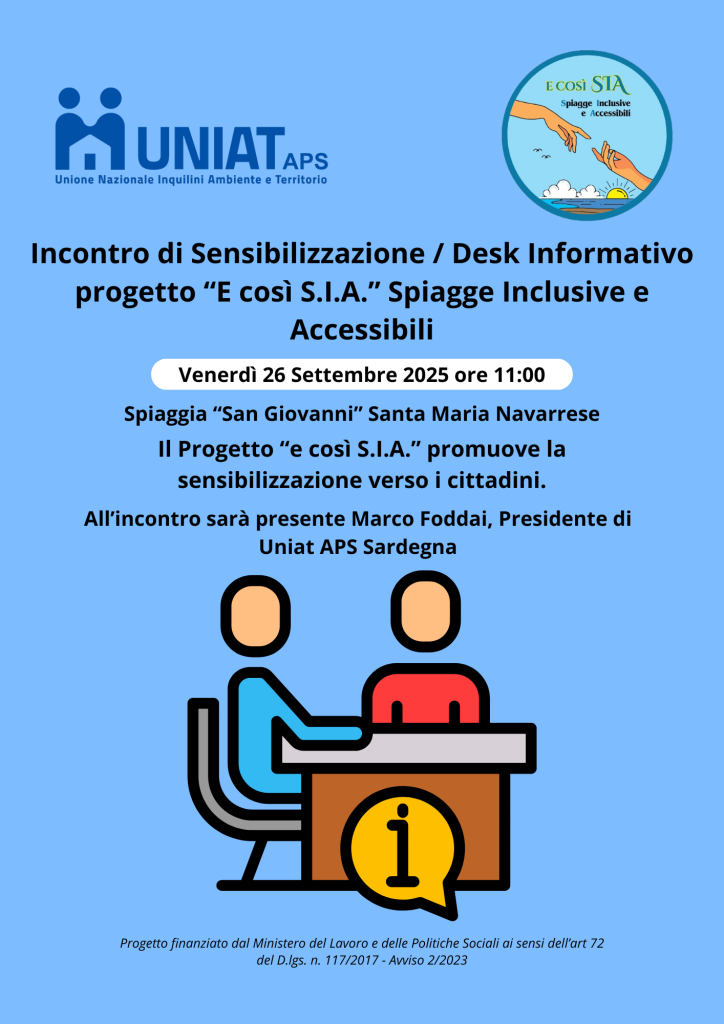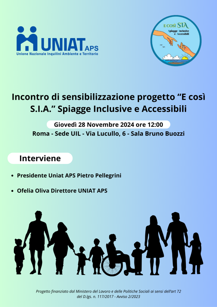 UNIAT, unitamente ai propri partner, intende realizzare un progetto finalizzato a favorire i processi di inclusione sociale delle persone con disabilità, degli anziani con problemi di autonomia e, più in generale, di tutte le persone con mobilità ridotta, anche temporanea, attraverso la realizzazione di interventi che aumentino l’accessibilità alle spiagge di mari e laghi. Una soluzione innovativa che guarda alla richiesta di supporto da parte delle persone con limitazioni (fisico- motorie, ma anche cognitive, sensoriali, …) in maniera innovativa, non ragionando distintamente per singole categorie di destinatari ma trasversalmente per “bisogni assistenziali” comuni che possono essere efficacemente affrontati attraverso attività che promuovano i diritti, riducano le diseguaglianze e accrescano le opportunità sociali, anche mediante la realizzazione delle altre attività (di sensibilizzazione e di animazione territoriale) promosse dal progetto.